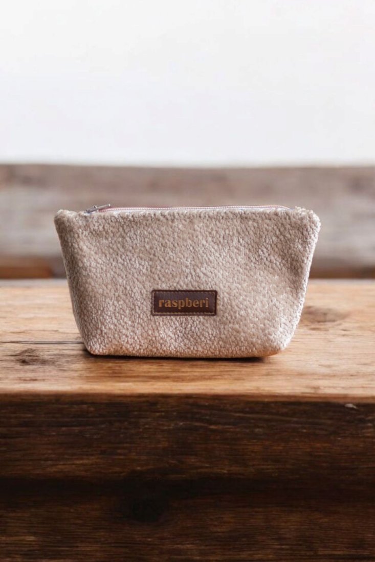 Średniej wielkości kosmetyczka wykonana z beżowej połyskującej tkaniny typu welur.