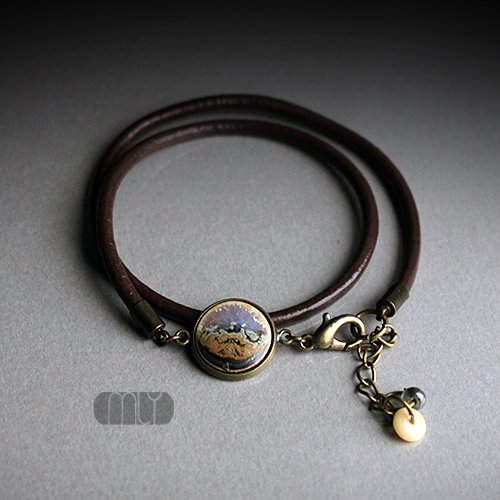 Efektowna bransoletka wykonana z rzemienia jubilerskiego, elementów w kolorze starego złota i ręcznie wykonanej ceramicznej zawieszki, szkliwionej mieszanką czarnych i brązowych szkliw z efektem plamek o subtelnym połysku, Obwód regulowany. Polecam