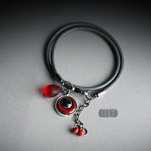Efektowna bransoletka wykonana z rzemienia jubilerskiego, elementów w kolorze starego srebra i ręcznie wykonanej ceramicznej zawieszki, szkliwionej mieszanką szarych i czerwonych szkliw z efektem plamek o subtelnym połysku, Obwód regulowany. Polecam