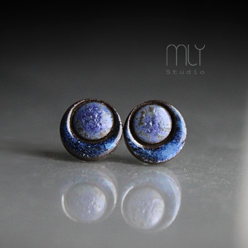 Ceramiczne okrągłe kolczyki w formie sztyftów, ręcznie wykonane z delikatnej gliny kamionkowej, jednostronnie szkliwione mieszanką błękitnych szkliw z efektem plamek, na antyalergicznych sztyftach w kolorze srebrnym. Średnica ok. 11mm. Polecam