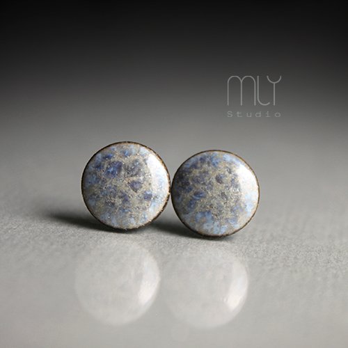 Ceramiczne okrągłe kolczyki w formie sztyftów, ręcznie wykonane z delikatnej gliny kamionkowej, jednostronnie szkliwione mieszanką szarobłękitnych szkliw z efektem plamek, na antyalergicznych sztyftach w kolorze srebrnym. Średnica ok. 11mm. Polecam