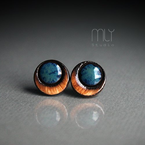Ceramiczne okrągłe kolczyki w formie sztyftów, ręcznie wykonane z delikatnej gliny kamionkowej, jednostronnie szkliwione mieszanką błękitnych i beżowo brązowych szkliw z efektem plamek, na antyalergicznych sztyftach w kolorze srebrnym. Średnica ok. 11mm. Polecam