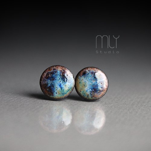 Ceramiczne okrągłe kolczyki w formie sztyftów, ręcznie wykonane z delikatnej gliny kamionkowej, jednostronnie szkliwione mieszanką brązowych i granatowych szkliw z efektem plamek, na antyalergicznych sztyftach w kolorze srebrnym. Średnica ok. 9mm. Polecam