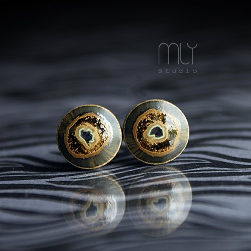 Ceramiczne okrągłe kolczyki w formie sztyftów, ręcznie wykonane z delikatnej gliny kamionkowej, jednostronnie szkliwione czarnych brązowych i granatowych szkliw z efektem plamek, na antyalergicznych sztyftach w kolorze srebrnym. Średnica ok. 11mm. Polecam
