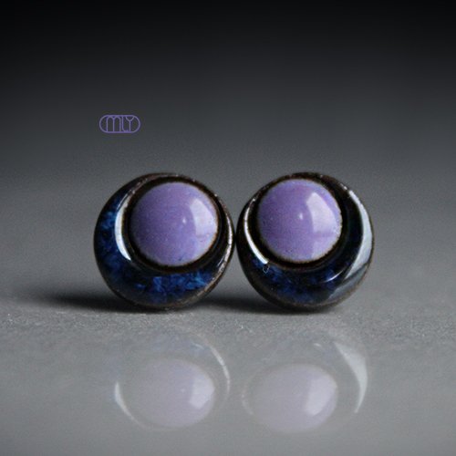 Ceramiczne okrągłe kolczyki w formie sztyftów, ręcznie wykonane z delikatnej gliny kamionkowej, jednostronnie szkliwione mieszanką granatowych i fioletowych szkliw z efektem plamek, na antyalergicznych sztyftach w kolorze srebrnym. Średnica ok. 11mm. Polecam