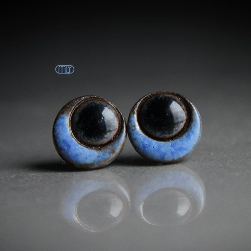 Ceramiczne okrągłe kolczyki w formie sztyftów, ręcznie wykonane z delikatnej gliny kamionkowej, jednostronnie szkliwione mieszanką błękitnych szkliw z efektem plamek, na antyalergicznych sztyftach w kolorze srebrnym. Średnica ok. 11mm. Polecam
