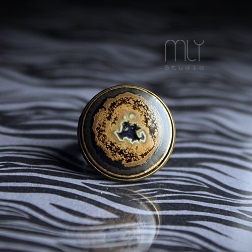 Efektowny pierścień z ceramicznym wypukłym oczkiem, ręcznie wykonanym z gliny kamionkowej, poszkliwionym mieszanką czarno brązowych szkliw z efektem plamek.Obrączka regulowana w kolorze starego złota średnica oczka ok 18mm. Polecam. Termin realizacji zamówienia to 1-2 dni