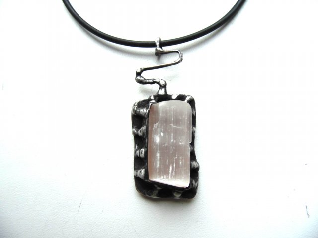Wisiorek wykonany techniką witrażową z miedzi, cyny i selenitu. Zawieszony na czarnej lince kauczukowej o długości ok. 45 cm. Wymiary ok. 6,5 na 2,5 cm.