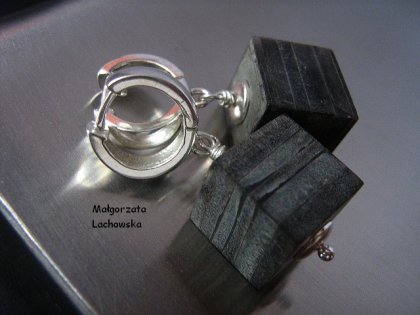 Kolczyki w formie sześcianów wykonane z muszli szarej o boku 12 mm oraz srebra próby 925, zawieszone na szerokich biglach typu kajdanki. Długość kolczyków wynosi 3,5 cm.