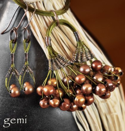 Komplet naszyjnik i kolczyki wykonane z oliwkowej linki jubilerskiej, pereł słodkowodnych w różnych odcieniach brązu i złota oraz oksydowanej i polerowanej miedzi. Obwód naszyjnika ok.42 + 8cm regulacji. Zapięcia federing. Wielkość wisiorka 5x5cm, całkowita długość kolczyków 5cm.