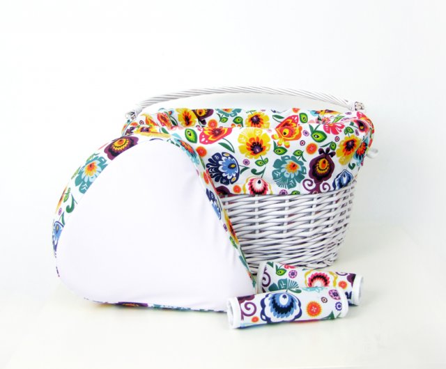 pokrowiec na siodełko+rączki w takim samym kolorze/wzorze materiału jak koszyk wraz z wkładem