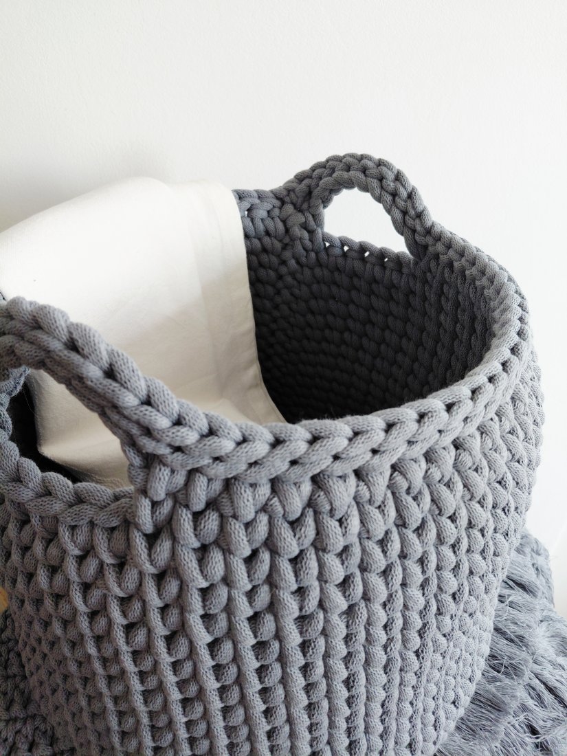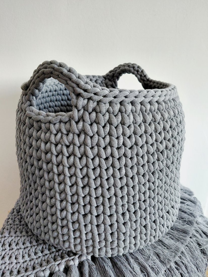 Ręcznie pleciony kosz z grubego sznurka bawełnianego, certyfikowanego w stalowym kolorze. Dekoracyjny i praktyczny dodatek do wnętrz, który pomieści wiele domowych akcesoriów.