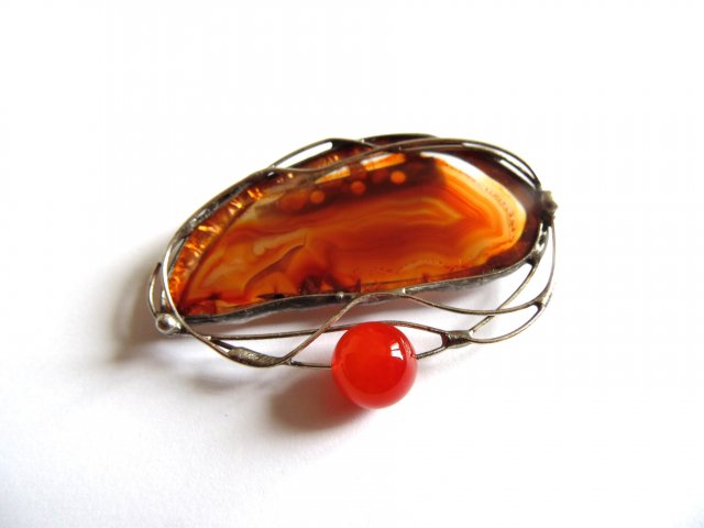 Broszka wykonana z miedzi, cyny i agatów. Zapięcie metalowe, Wymiary ok. 6,5 na 4 cm.