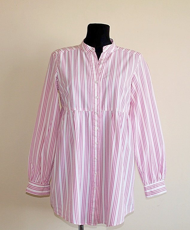 Koszula marki Ginatricot w biało różowe paski, materiał 100% bawełna. Zapinana na małe guziczki. Rozmiar z metki 40. Odcinana poniżej biustu, dół ułożony w małe zakładki. Stan bardzo dobry. Podaję wymiary mierzone na płasko;