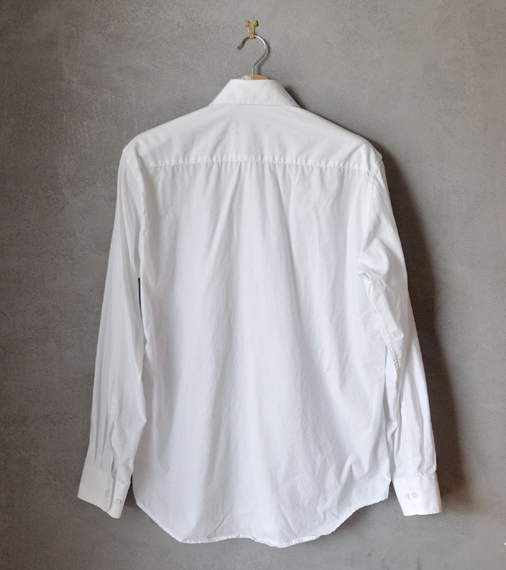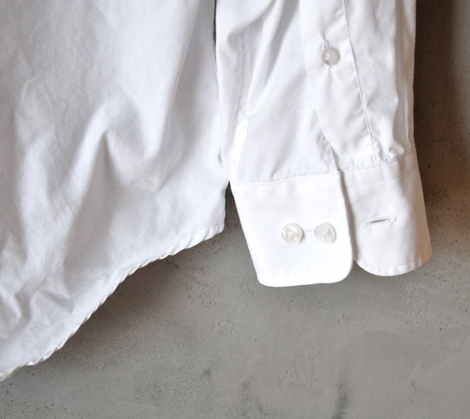Białe logowane guziki, usztywniane mankiety i kołnierzyk.