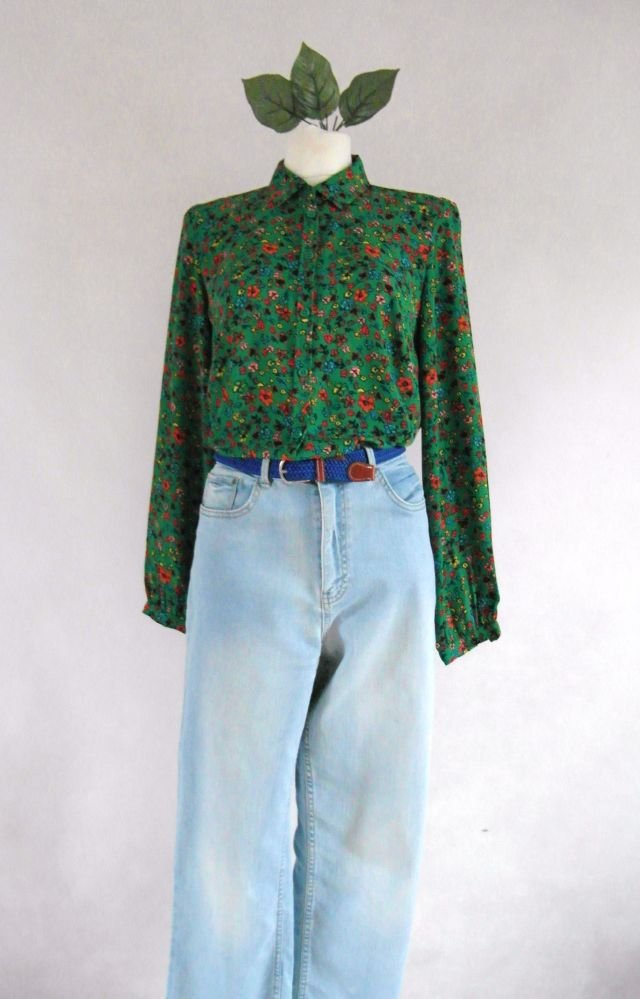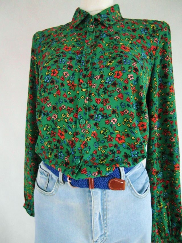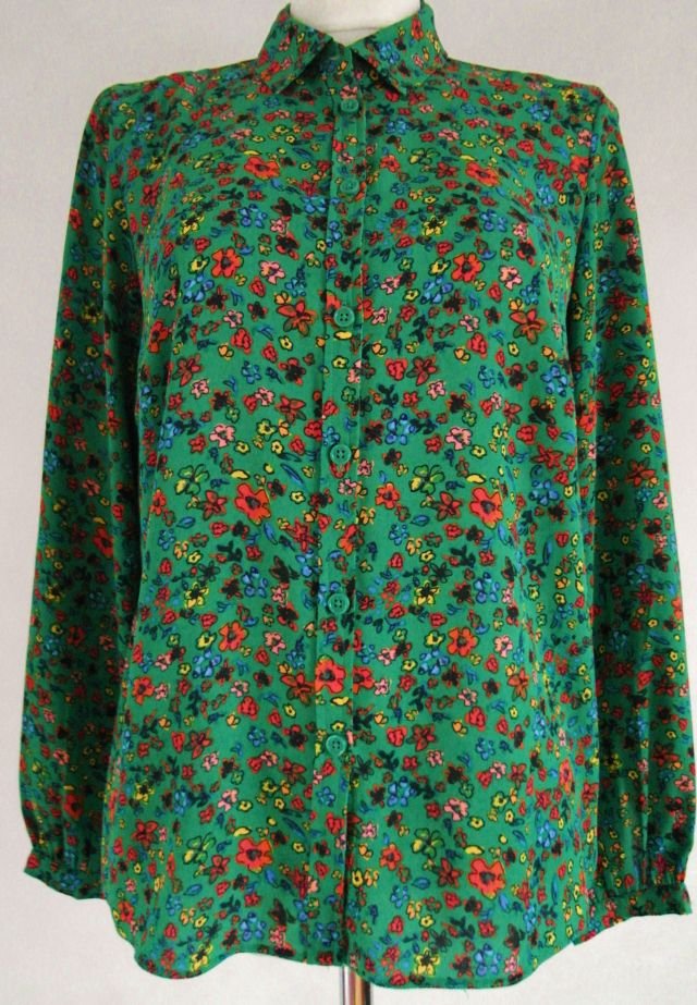 kolor świeżej trawy i rozrzucone kwiatki - pomarańczowe, żółte, chabrowe i jasny róż. klasyczna z kołnierzykiem, mankiety zapinane na guzik.