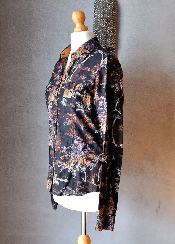 Uszyta z cienkiej, batystowej tkaniny (bawełna z jedwabiem) w piękny, kwiatowy, nieco mroczny wzór. Czarna z brązowymi, fioletowymi i czerwonymi detalami. Zapinana na opalizujące guziki z masy perłowej - logowane. Fason klasyczny: kołnierzyk, mankiety na guziki; na piersiach małe, zapinane kieszonki.