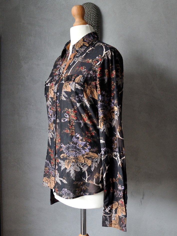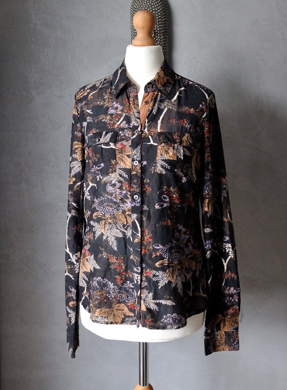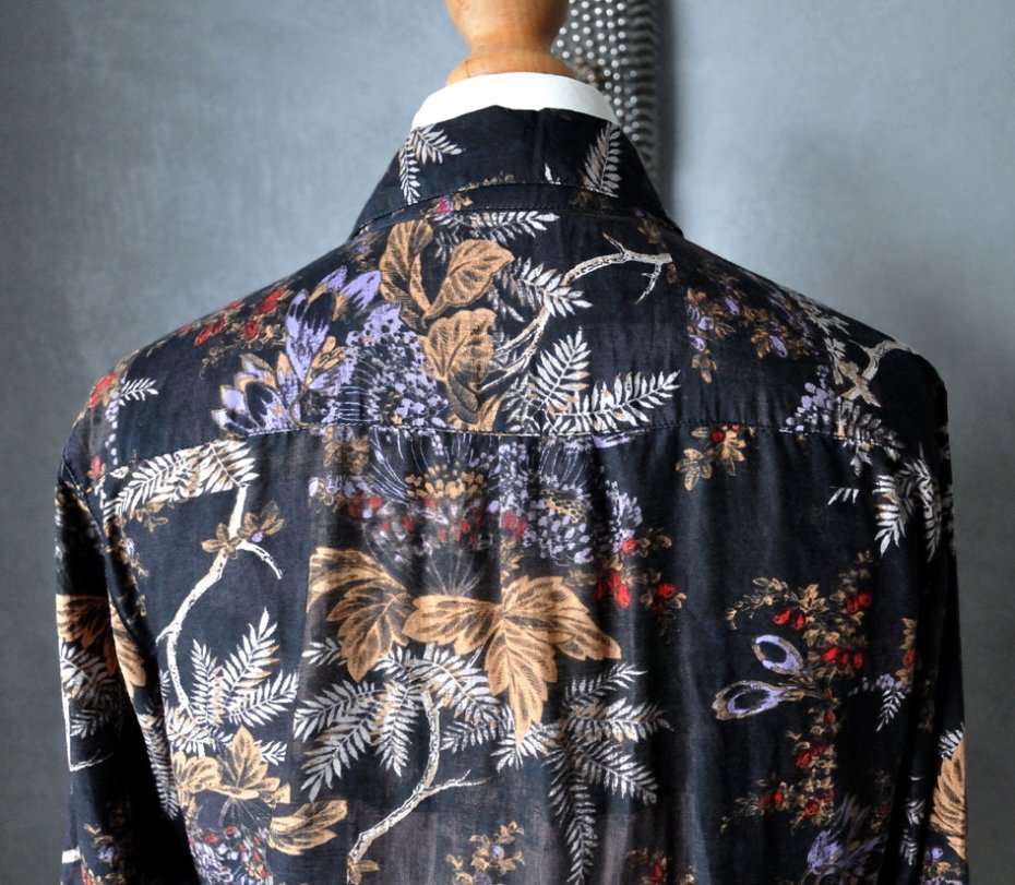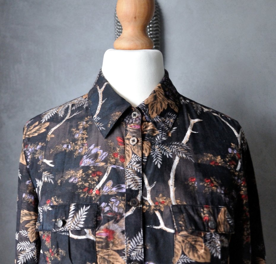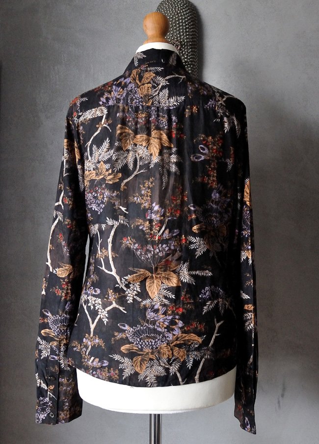 Uszyta z cienkiej, batystowej tkaniny (bawełna z jedwabiem) w piękny, kwiatowy, nieco mroczny wzór. Czarna z brązowymi, fioletowymi i czerwonymi detalami. Zapinana na opalizujące guziki z masy perłowej - logowane. Fason klasyczny: kołnierzyk, mankiety na guziki; na piersiach małe, zapinane kieszonki.