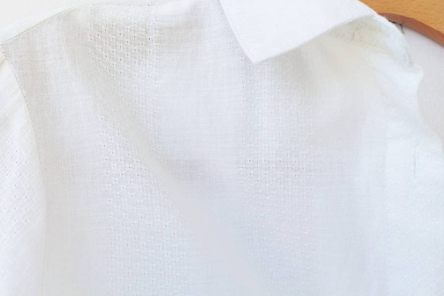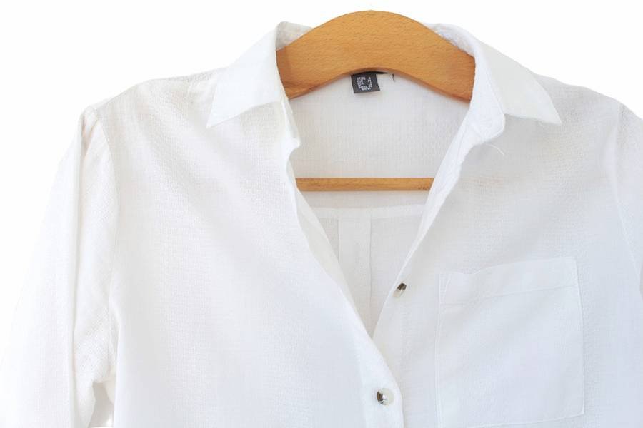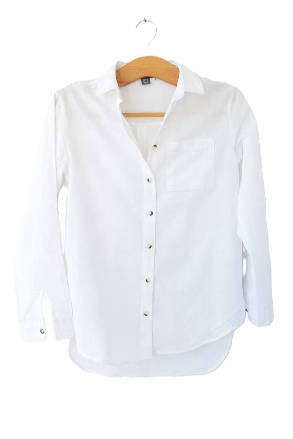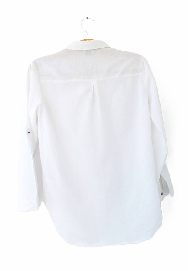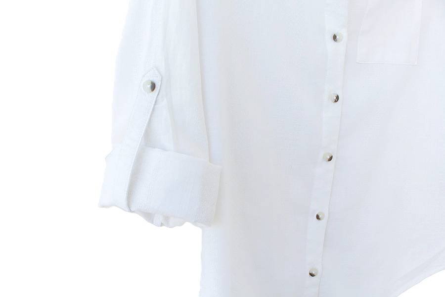 Biała koszula vintage z miękkiej bawełny o ciekawej strukturze. Rękawy z opcją podpięcia na guzik które można podwinąć i nosić w wersji trzy czwarte. Ciekawe guziki nadają jej smart casualowy charakter. Materiał jest miękki, miły w dotyku, cienki - idealny na lato. Można nosić klasycznie w wersji zapiętej lub narzucić na top czy T-shirt na rozpięto.