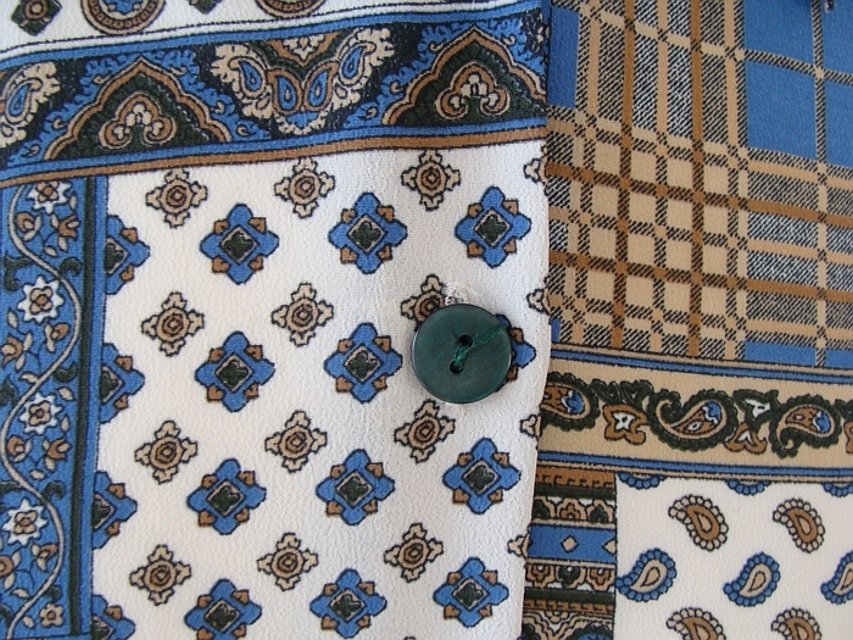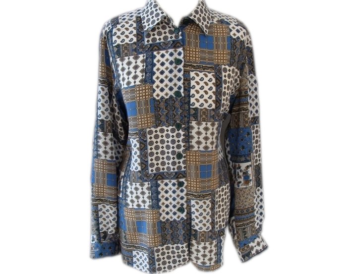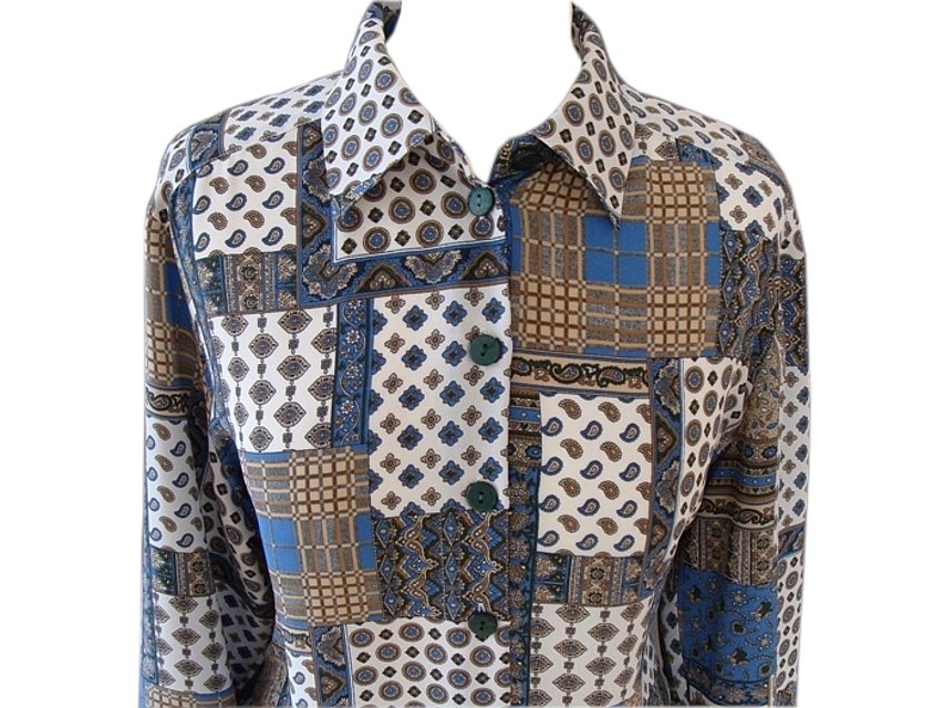 Koszula vintage o oryginalnym designie, przywodzącym na myśl patchwork z różnych wzorów. Stonowana paleta barw – połączenie beżu, błękitu i kremu – sprawia, że świetnie komponuje się zarówno z jeansami, jak i z klasycznymi beżowymi spodniami. Równie dobrze wygląda zestawiona ze spódnicą.