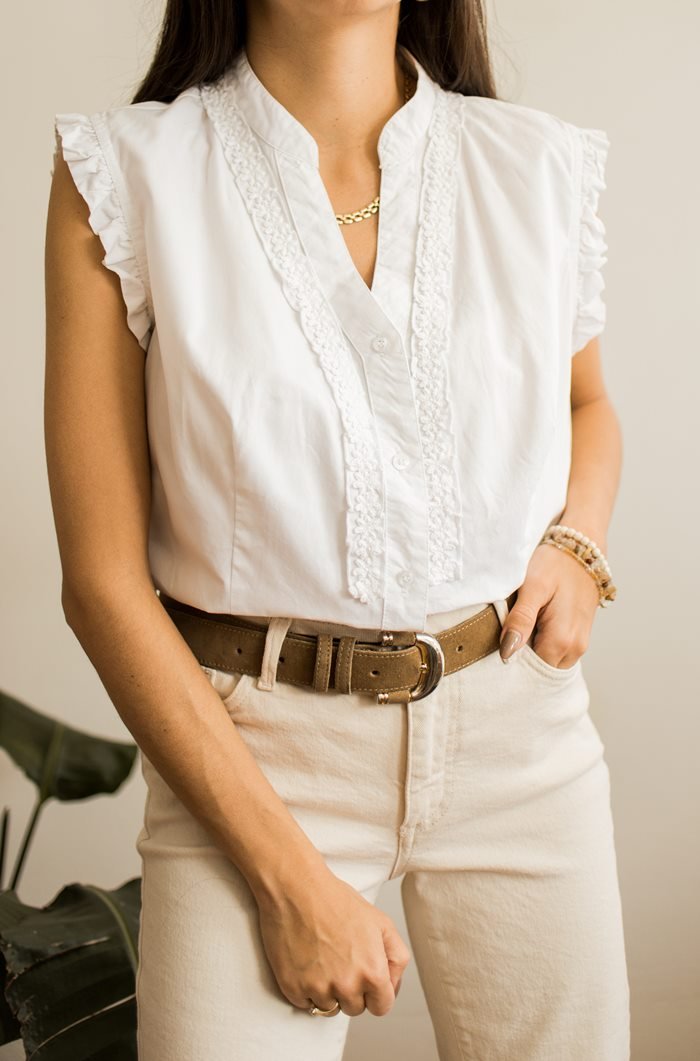 Biała koszula z koronką i falbankami.