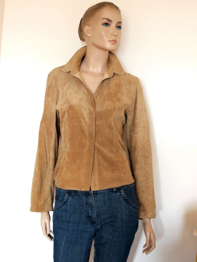 taliowana koszula niemieckiej marki blacky dress. Materiał 100% skóra zamszowa w kolorze jasnego beżu. bez podszewki, zapięcie na dwie napy. rozmiar z metki 38 (raczej małe 38), na manekinie o rozmiarze 38. niewielkie przybrudzenie w newralgicznych miejscach czyli brzeg rękawów i zagięcie kołnierzyka. Podaję wymiary mierzone na płasko;