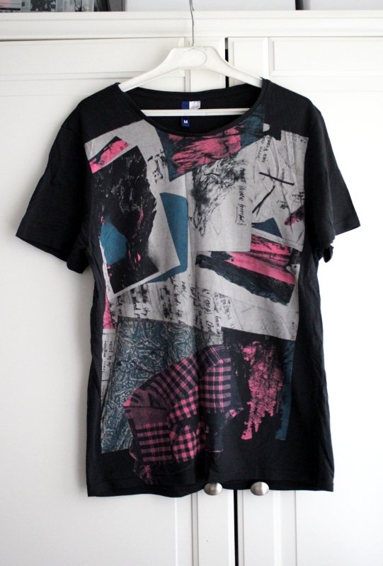 T-shirt marki Divided by H&M, w kolorze bardzo ciemnym szarym/spranym czarnym. Nadruk różowo-beżowo-czarno-morski.