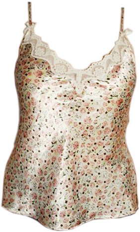 Lekka, niezwykle kobieca koszulka w romantyczne różyczki, ozdobiona koronką przy dekolcie. Bluzka nie ma metki, ale materiał oceniam na poliester.