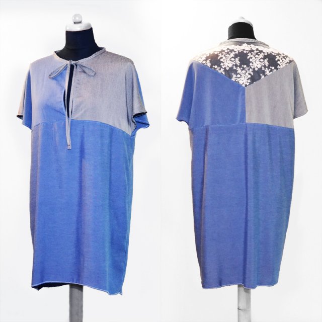 Koszula do spania wykonana została z niebieskiego i szarego bawełnianego materiału oraz pięknej kremowej koronki na plecach. Wiązana z przodu na kokardkę. Prosty krój, bardzo wygodna, tył nieco dłuższy od przodu. Rozmiar M/L