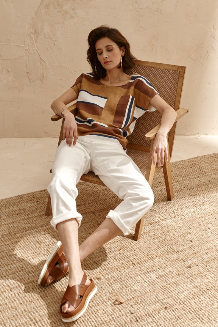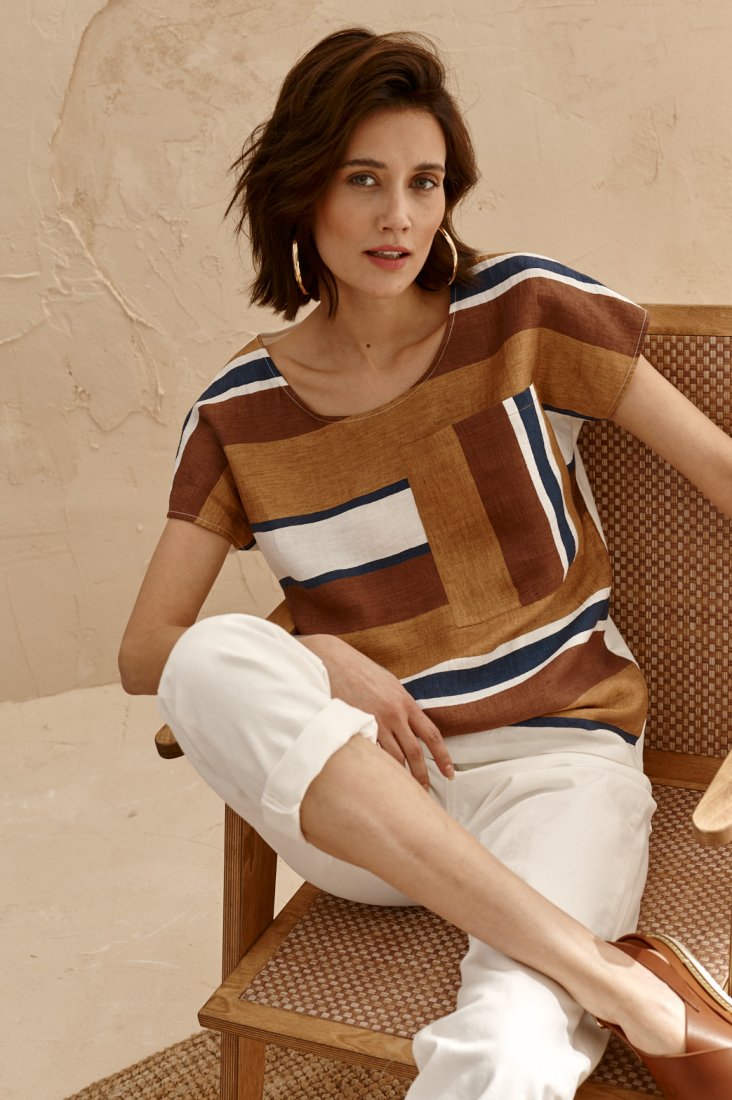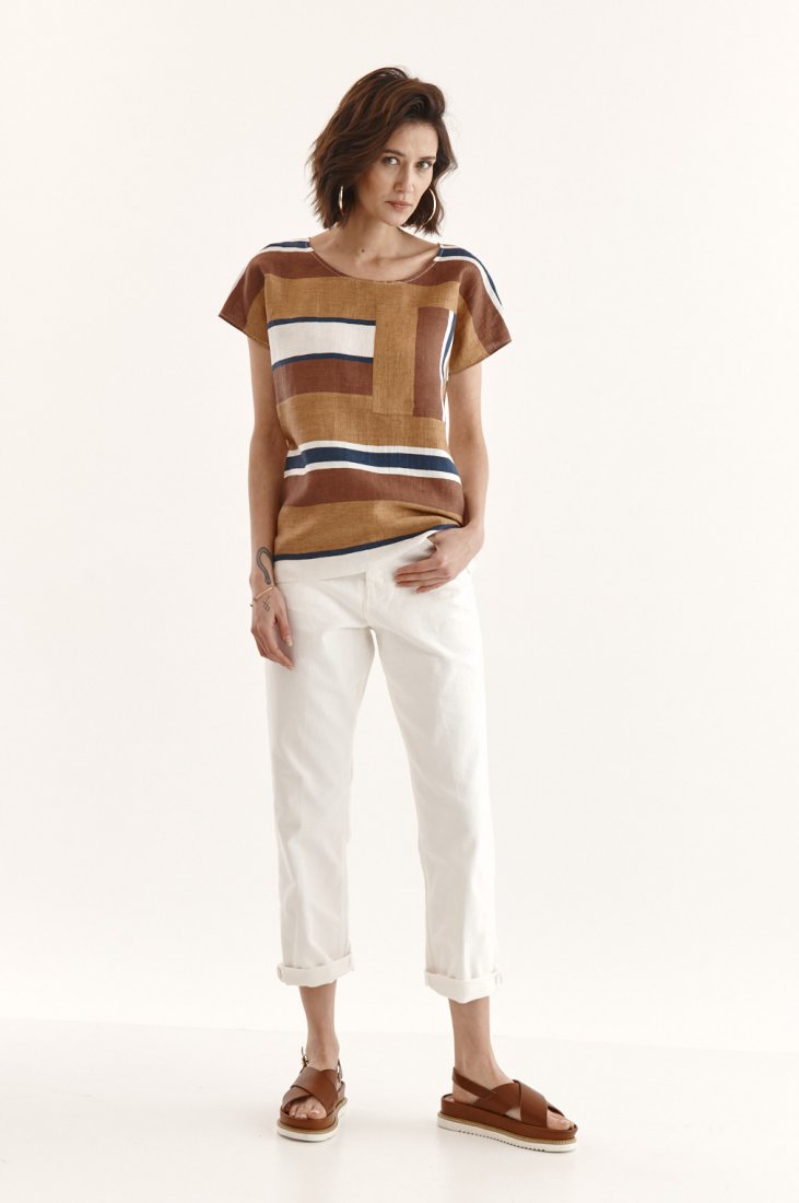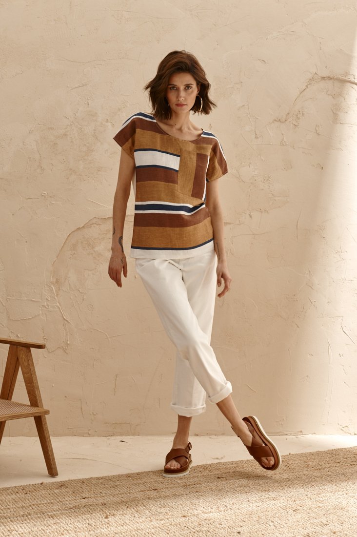 Bluzka - koszulka Bella przód z tkaniny, tyl z dzianiny. Tkanina z unikatowego lnu, tkane pasy. Bluzka w formie kimona, z krótkim rękawem. Szyja z okrągłym dekoltem. Na boku przodu naszyta ozdobna kieszonka