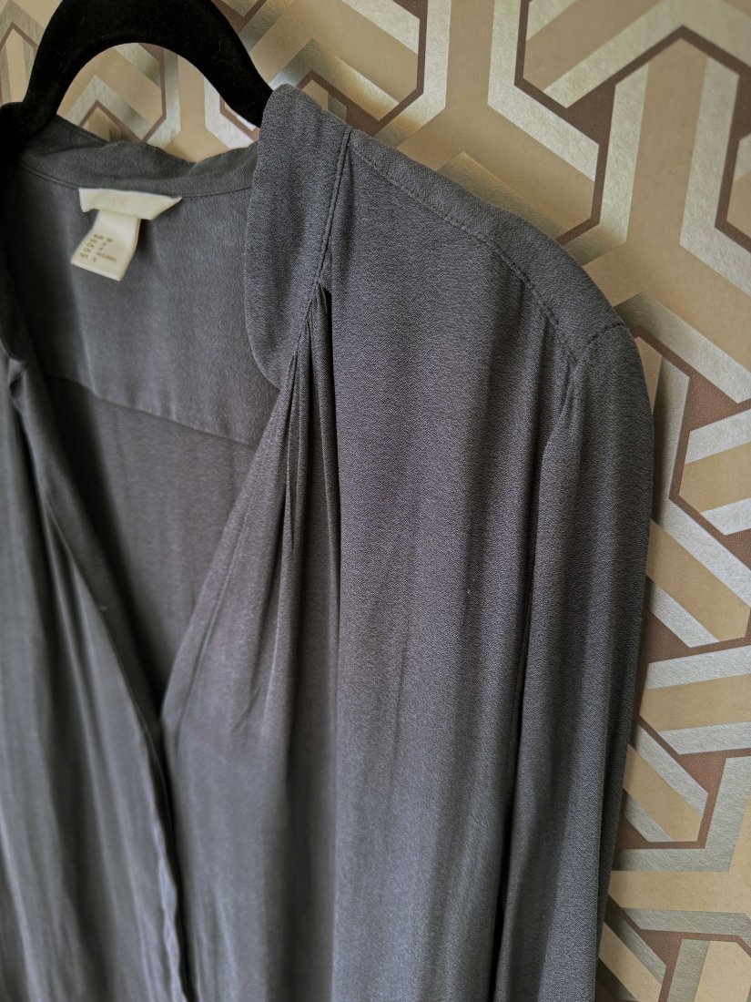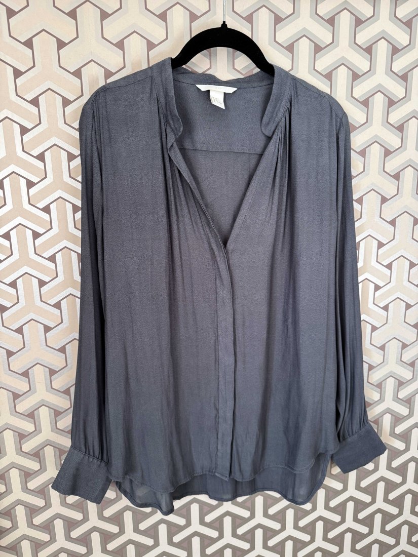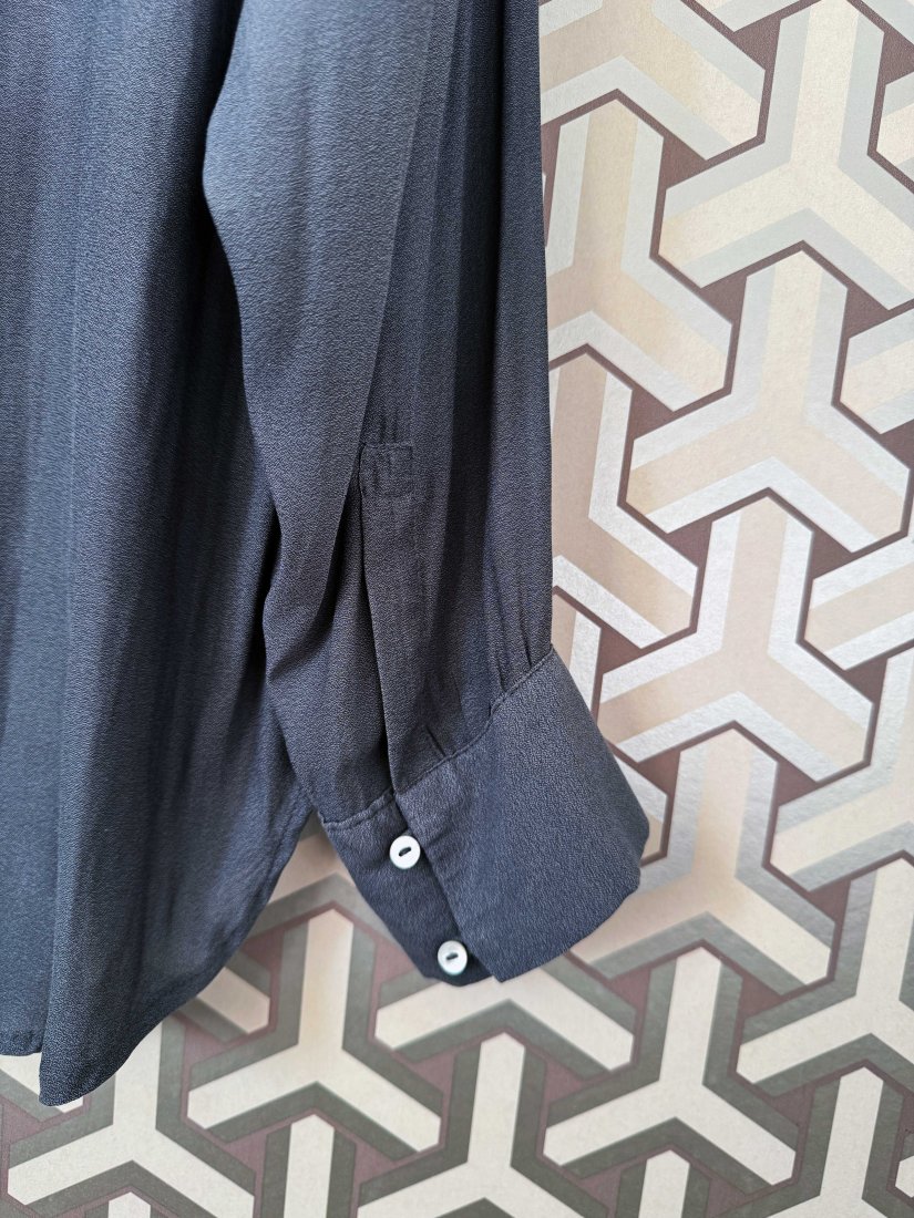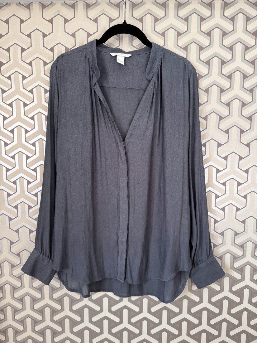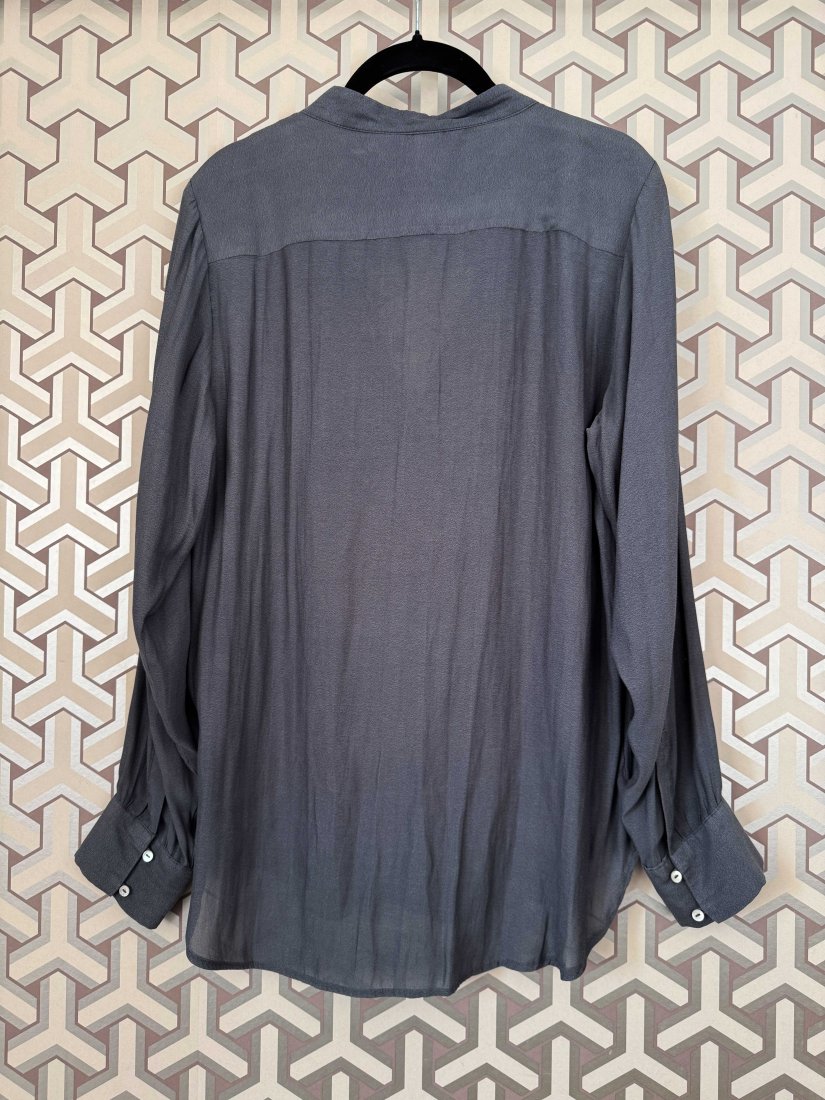 Grafitowo-szara koszulowa bluzka, lekko transparentna, tył trochę dłuższy, bardzo ładnie leży.