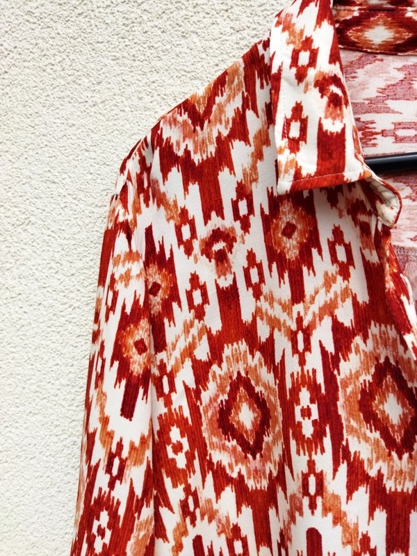 Koszulowa sukienka z najprawdopodobniej z wiskozowej tkaniny w etniczne wzory w kasztanowo -rudej kolorystyce na białym tle. Z kołnierzykiem , z karczkiem z tyłu. zapinana na całej długości na małe guziczki.