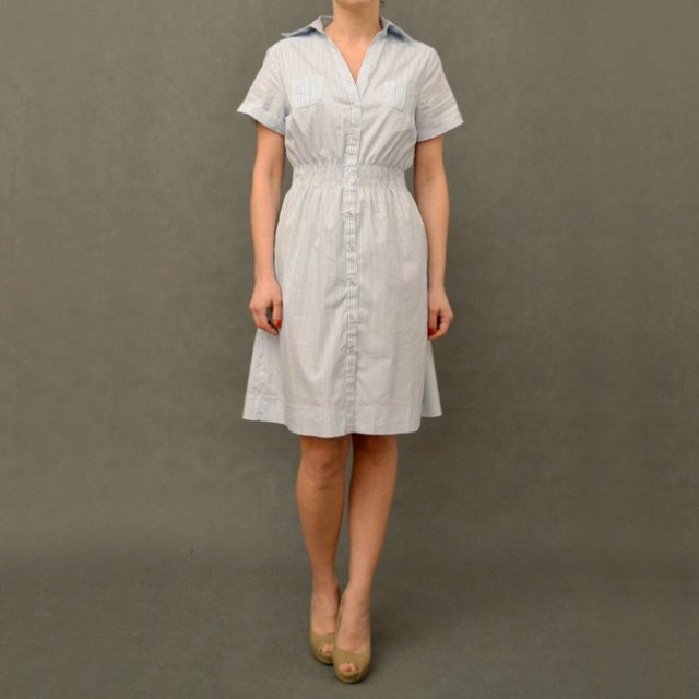 Koszulowa sukienka w białe i błękitne paseczki. W talii gumka. Całość zapinana na guziczki. Po bokach kryte kieszonki.