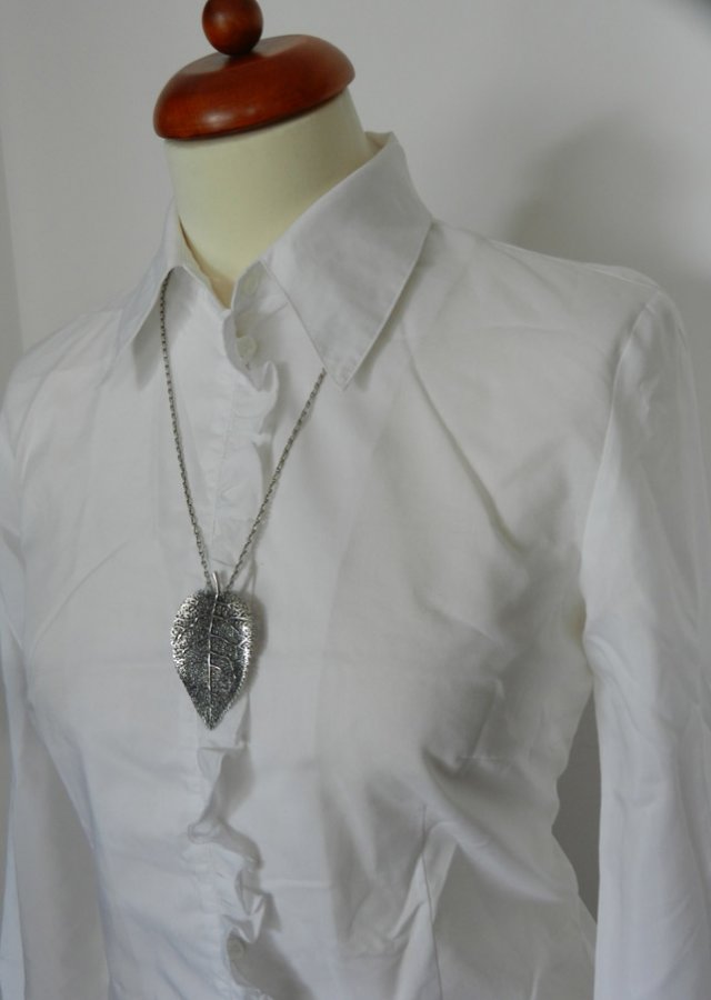 Biała bluzka koszulowa z żabotem.