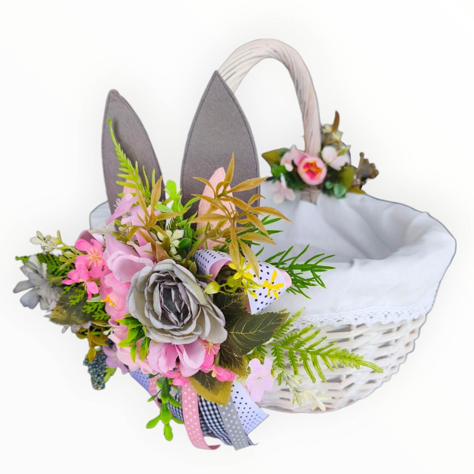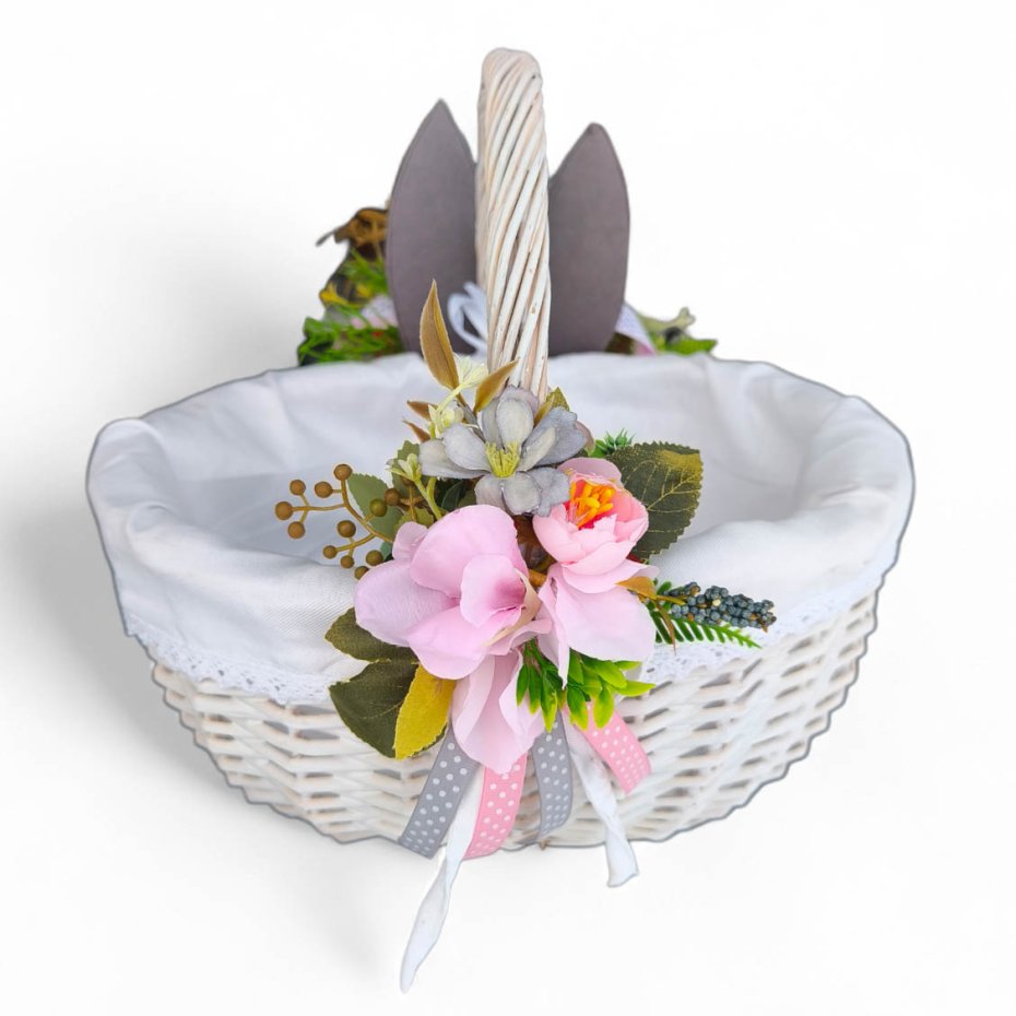 Piękny, pleciony, biały ręcznie wykonany koszyk wielkanocny, udekorowany kolorowymi sztucznymi kwiatami z dwoch stron.