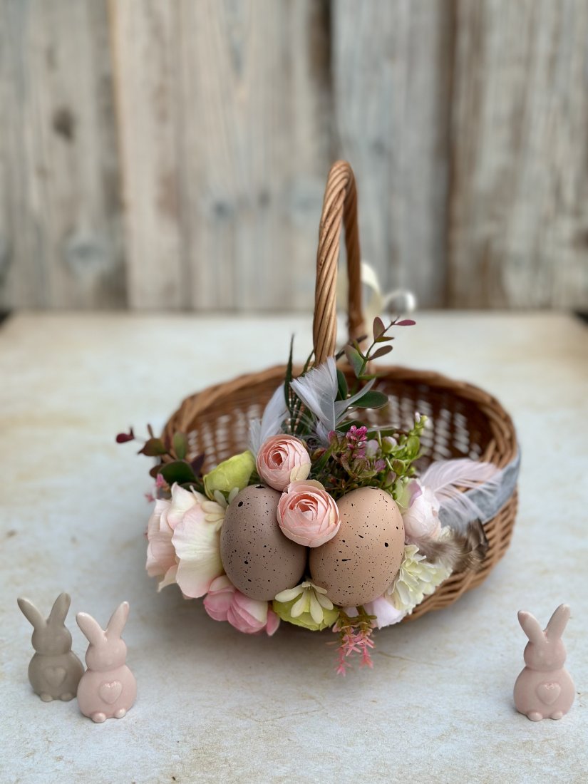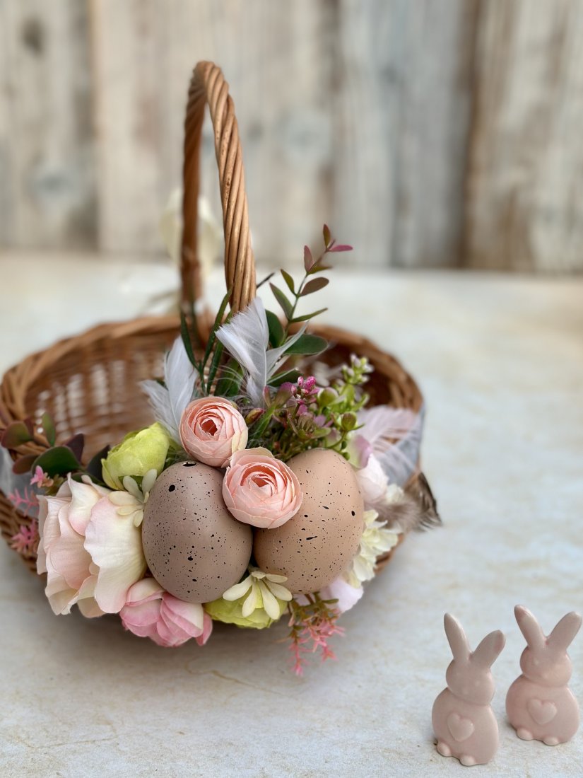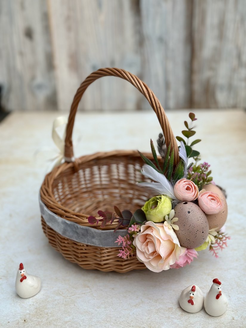 Koszyczek wielkanocny z naturalnej wikliny, ozdobiony kwiatami i dodatkami sztucznymi. Dekoracja na stałe przymocowana do koszyczka, przygotowana przeze mnie ręcznie :)