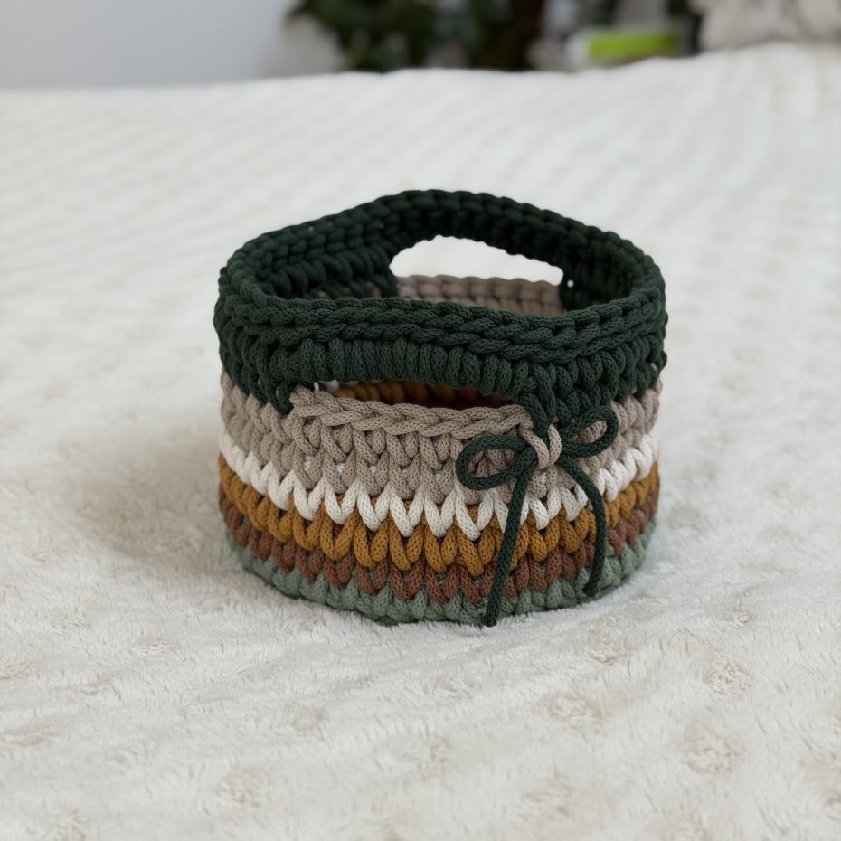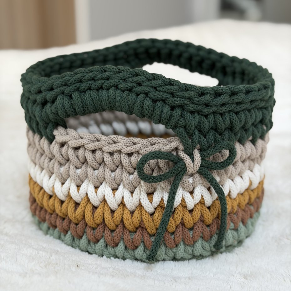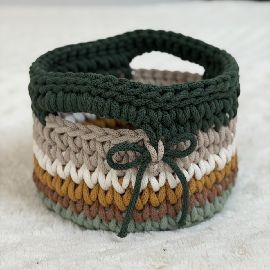 Ten ręcznie wykonany koszyczek powstał z wysokiej jakości bawełnianego sznurka polskiej firmy, z dbałością o każdy detal. Delikatne połączenie kolorów nadaje mu lekkości i sprawia, że pięknie wpisuje się w jasne, przytulne wnętrza.