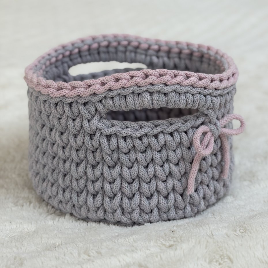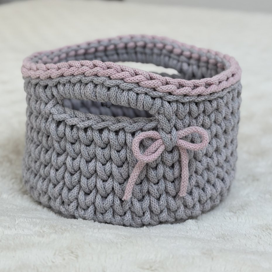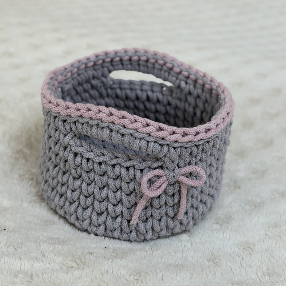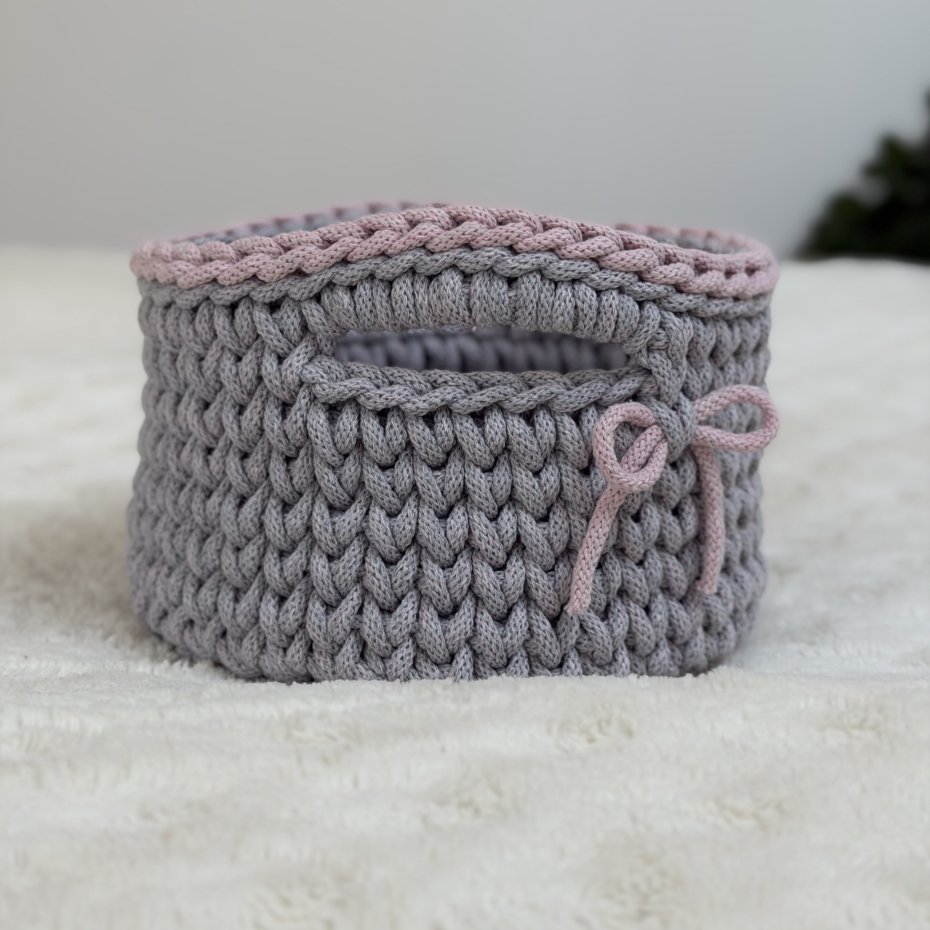 Ten ręcznie wykonany koszyczek powstał z wysokiej jakości bawełnianego sznurka polskiej firmy, z dbałością o każdy detal. Delikatne szaro-różowe połączenie kolorów nadaje mu lekkości i sprawia, że pięknie wpisuje się w jasne, przytulne wnętrza.