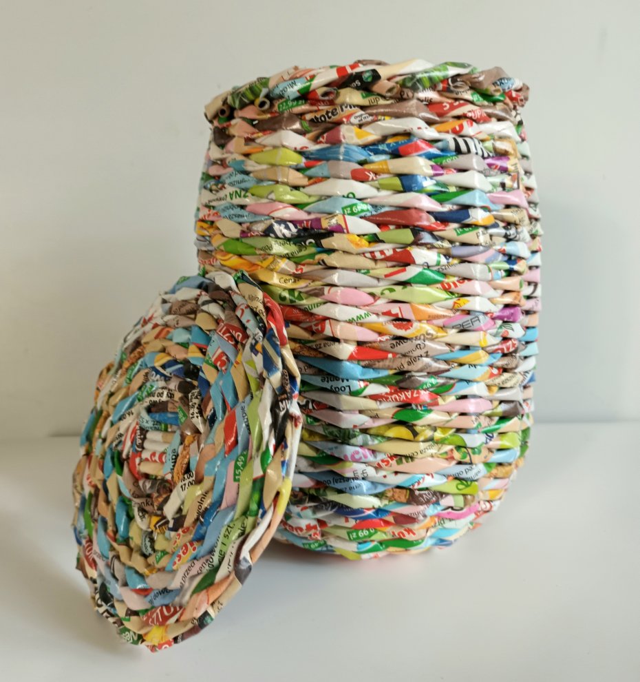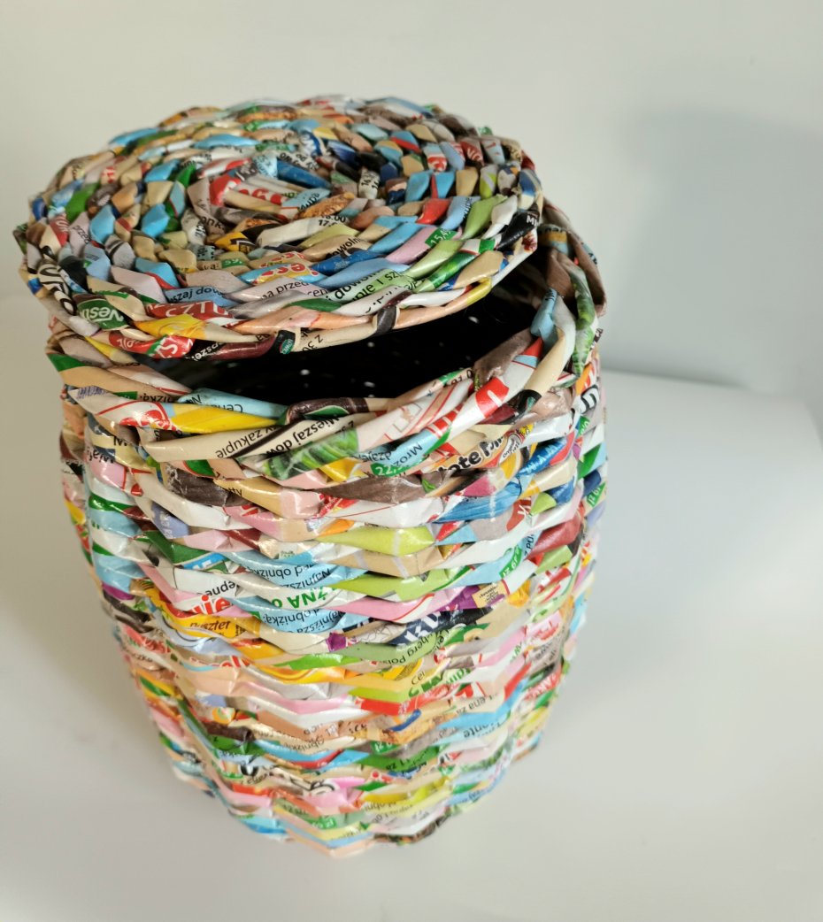 koszyk wykonany w ręcznie z kolorowych gazet. Każdy egzemplarz jest jedyny w swoim rodzaju – niepowtarzalny wzór, staranne wykończenie i solidna konstrukcja sprawiają, że to nie tylko praktyczny dodatek, ale także piękna dekoracja wnętrza. Całość zabezpieczona lakierem akrylowym, dzięki czemu koszyk jest sztywny I trwały.