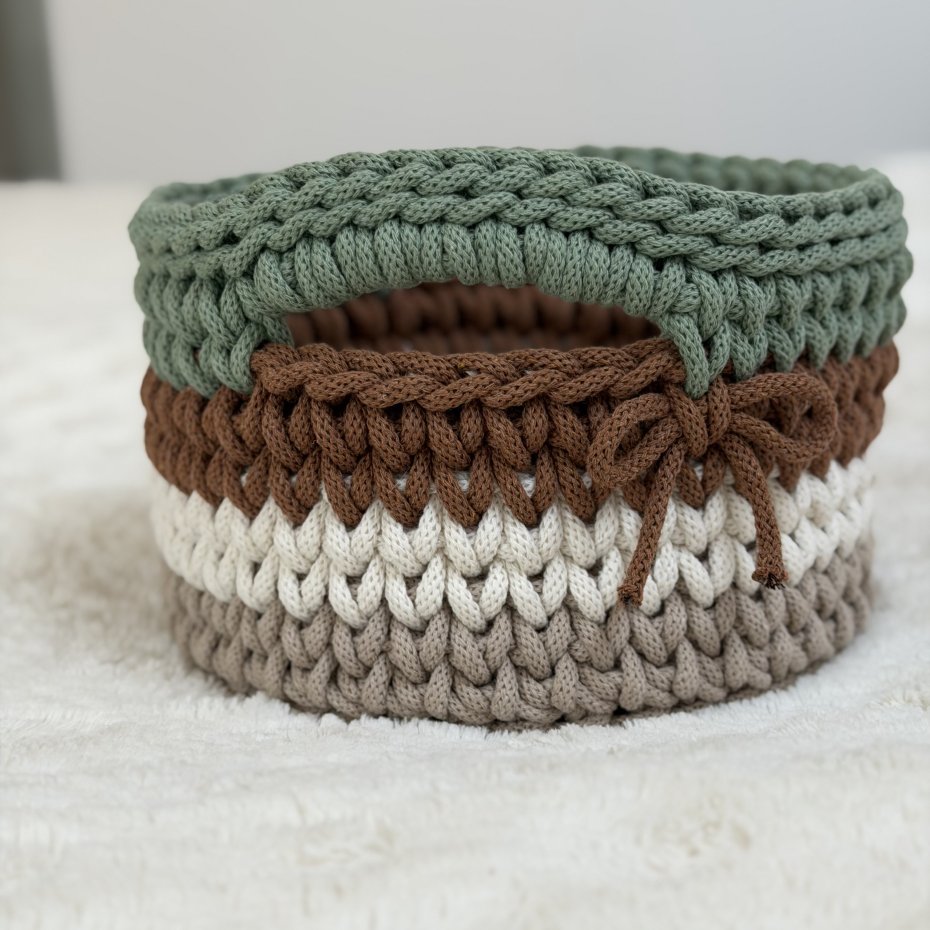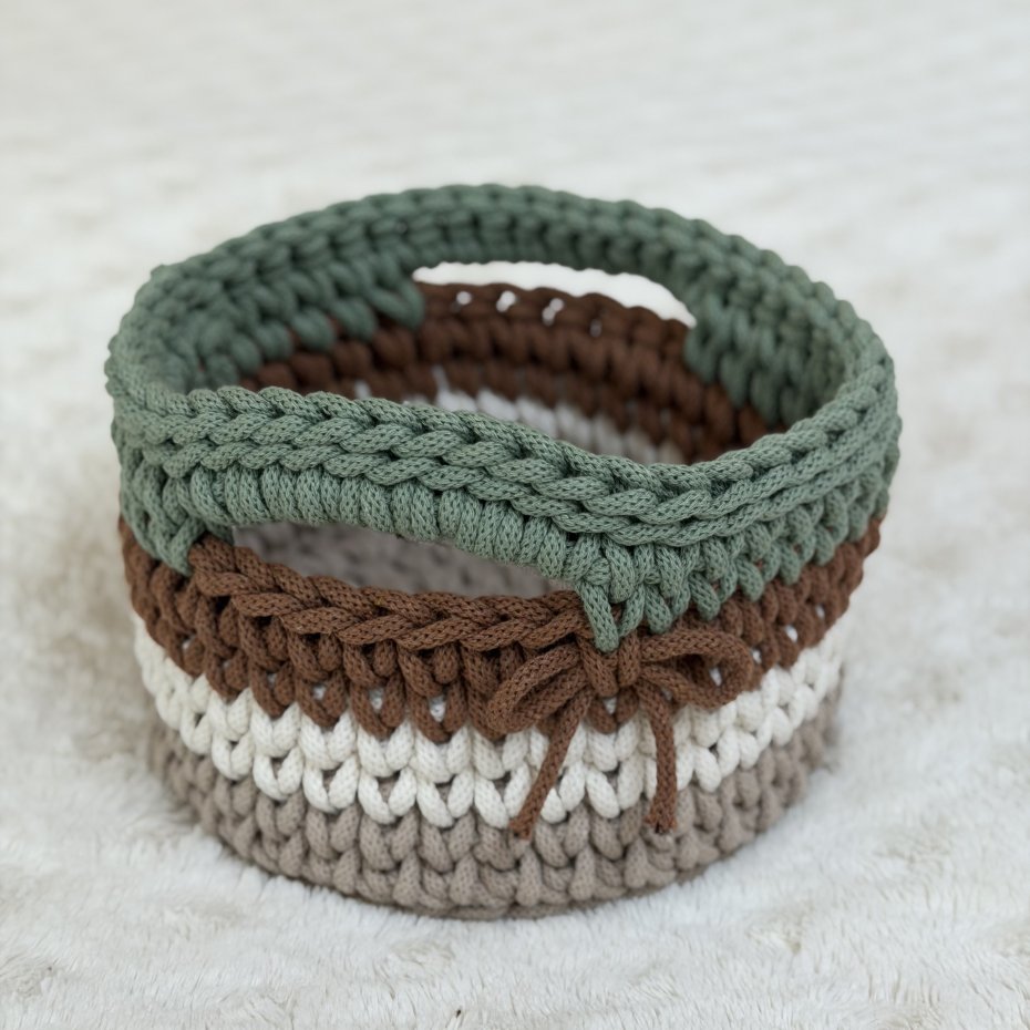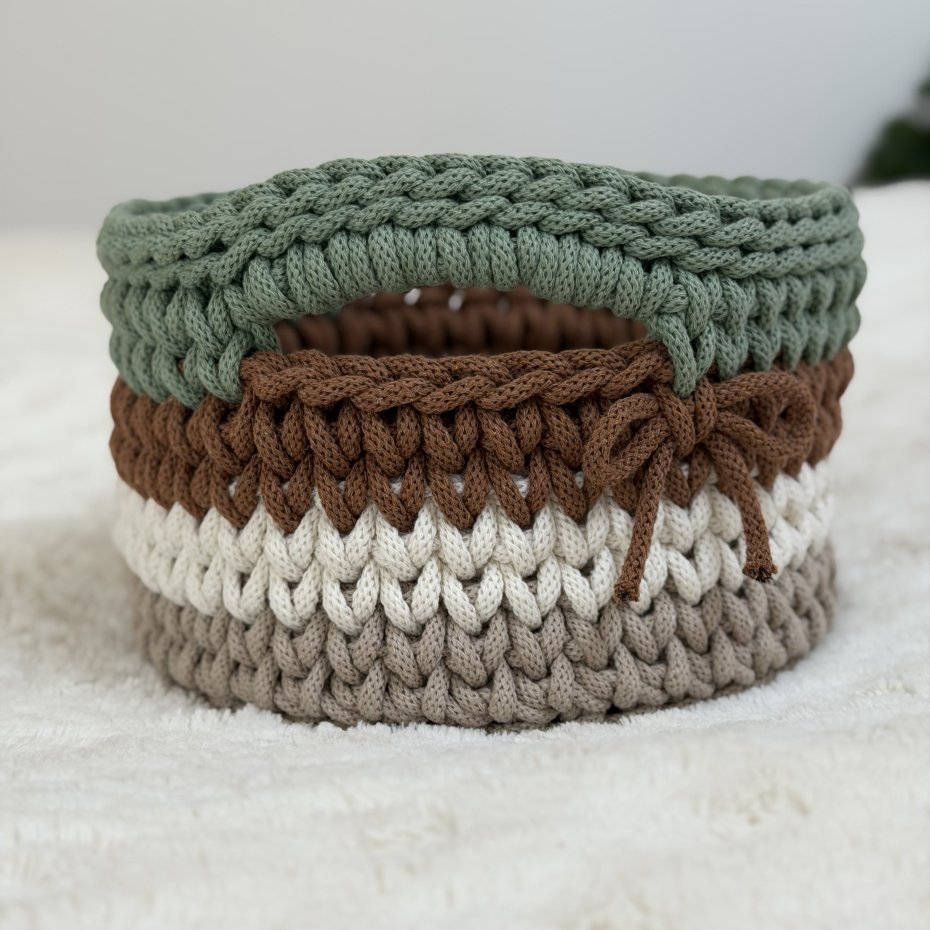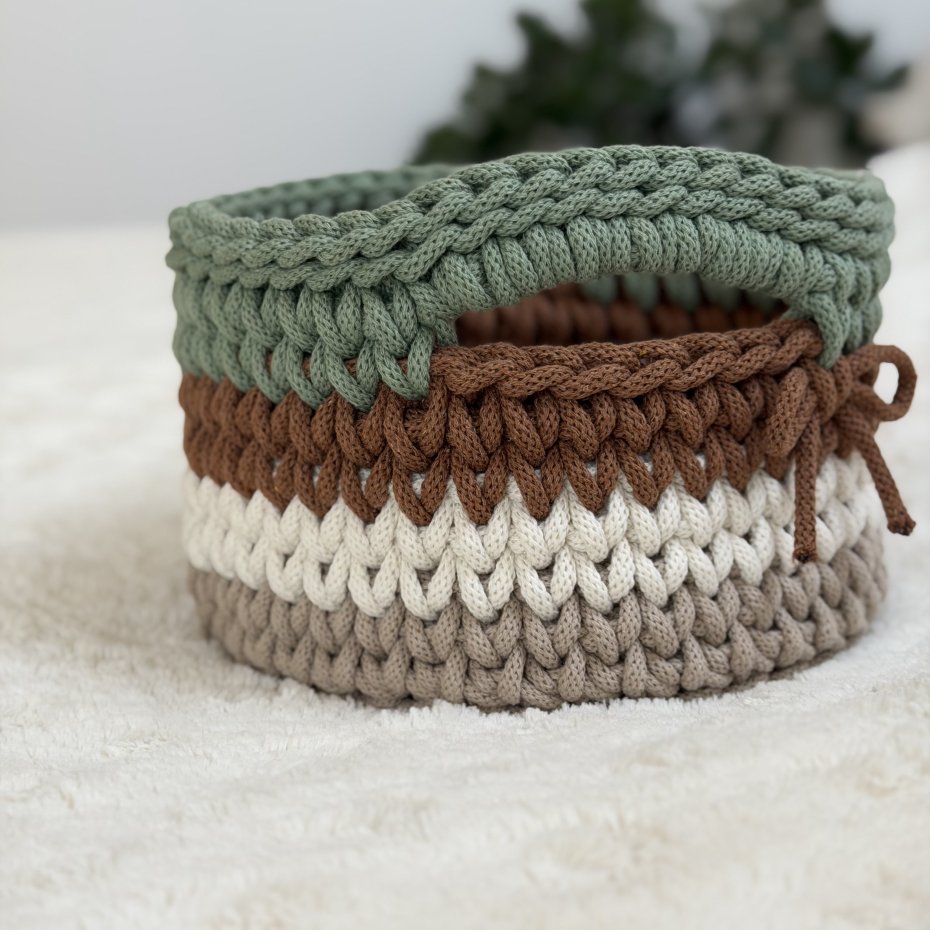 Ten ręcznie wykonany koszyczek powstał z wysokiej jakości bawełnianego sznurka polskiej firmy, z dbałością o każdy detal. Delikatne połączenie kolorów nadaje mu lekkości i sprawia, że pięknie wpisuje się w jasne, przytulne wnętrza.