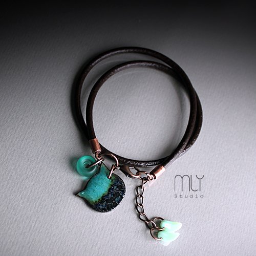 Efektowna bransoletka wykonana z rzemienia jubilerskiego, elementów w kolorze miedzi i ręcznie wykonanej ceramicznej zawieszki, szkliwionej błyszczącym zielonym szkliwem, Obwód regulowany, długość elementu ceramicznego ok 18mm. Polecam . Termin realizacji zamówienia to 1-2 dni.