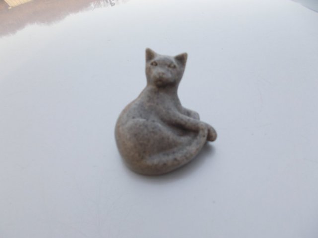 Niewielka Kocia Figurka z jakiejś masy kamiennej w kolorze szarym z ciemniejszym delikatnym pieprzowym nakrapianiem. Nalepka od spodu DEVON Quinetssence England OC2 Basil - pisane jak bazylia :) Filcykiem podklejona,chłodna bardzo gładka. Ciekawa. Do kolekcji ina prezent :)