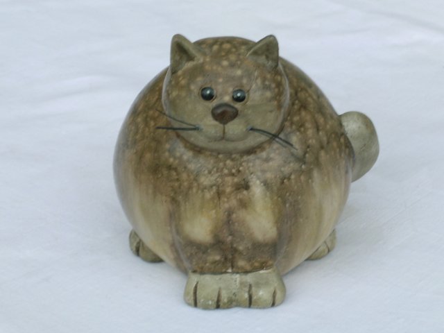 Oryginalnej urody pan Kot - z lekkiej ceramiki, pusty w środku. Na satynowo szkliwiony. Nie tylko śmieszne proporcje, ale i te wąsy :) Pękatość 11; wysokość 12 cm. Stan zachowania bardzo dobry.