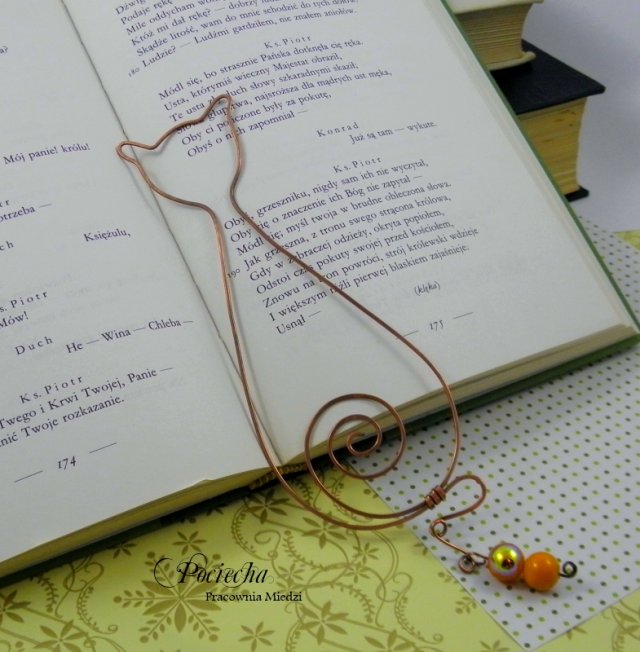Feliks szuka dobrej książki. Oryginalna zakładka do książki wykonana w całości ręcznie. Kuta z miedzi, patynowana na antyczny kolor, ozdobiona szklanymi koralikami. Feliks wraz z ogonem ma wysokość ok. 18,5 cm. W najszerszym miejscu ok. 5,4 cm.