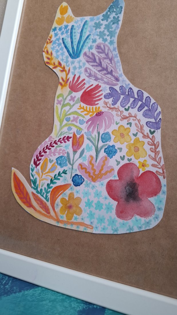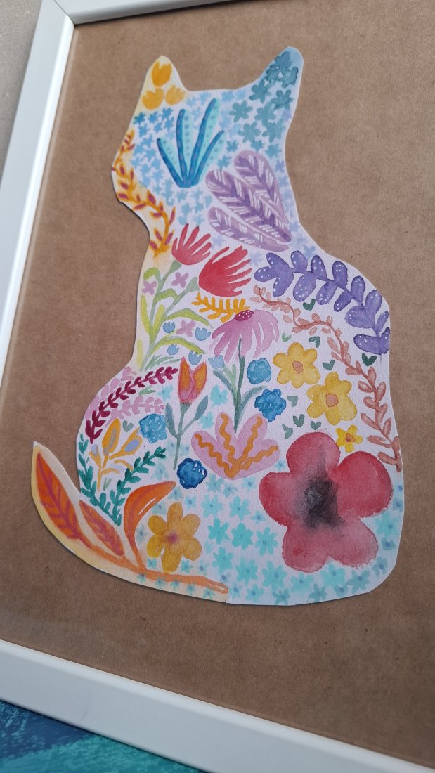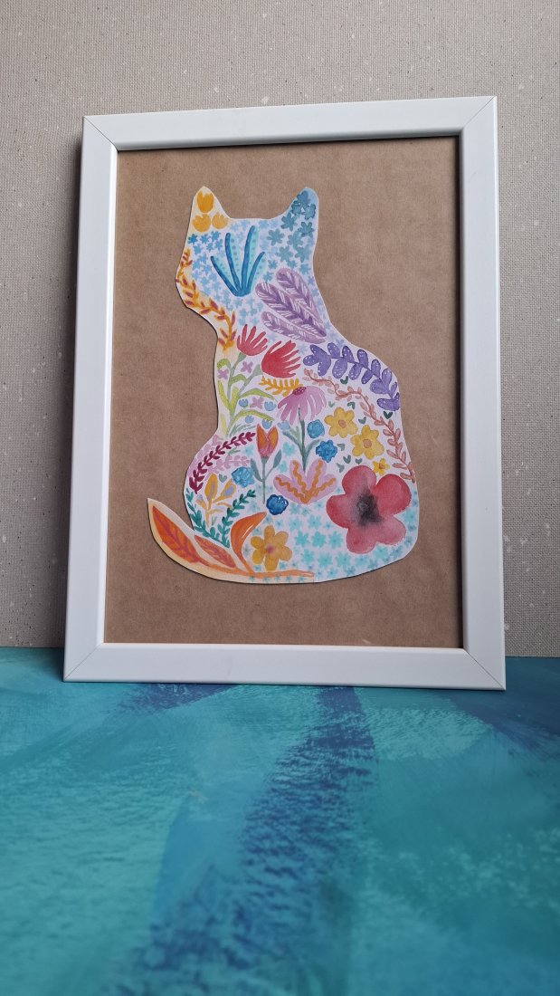 Piękna akwarela w kształcie kota zaprezentowana w ramce.
