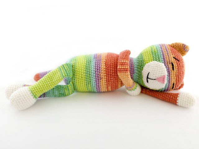 Tęczowy kotek to niepowtarzalna i oryginalna zabawka dla dziecka. Miękka i miła do przytulania. Stanie się ulubioną zabawką dziecka, mozna ją zabrać na każdą przygodę.Kot wykonany z tęczowej włóczki odpowiedniej dla maluszków.Wszystkie elementy są przyszyte, nosek i oczka wyszyte muliną. Wypełnienie antyalergiczne