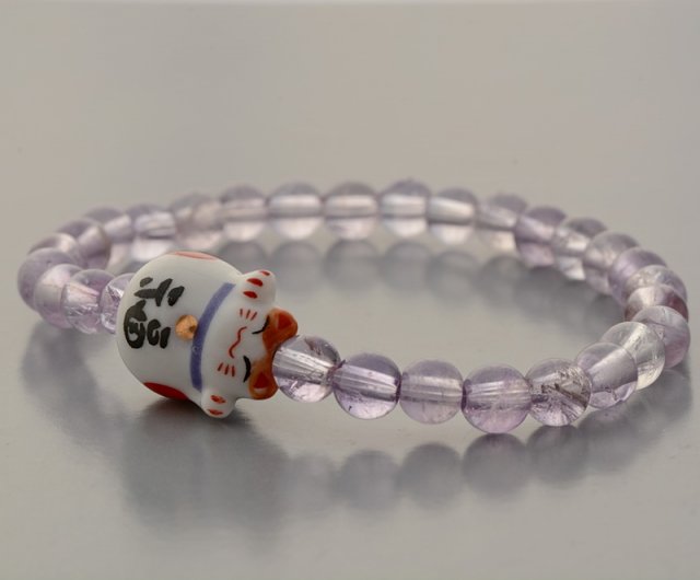 Zabawna, urocza bransoletka wykonana z kuleczek przeźroczystego ametystu (6mm) oraz ceramicznego chińskiego kota szczęścia.