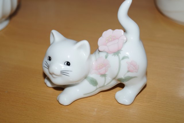 Porcelanowa figurka kotka sygnowana ST MICHAEL, numerowana, pochodzi z 1987 roku, porcelana w kolorze białym ozdobiona przestrzennym motywem kwiatowym w pastelowych kolorach, idealna do kolekcji