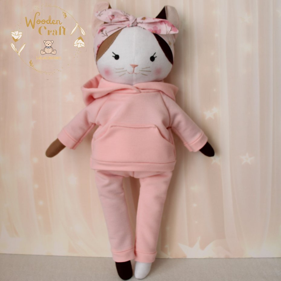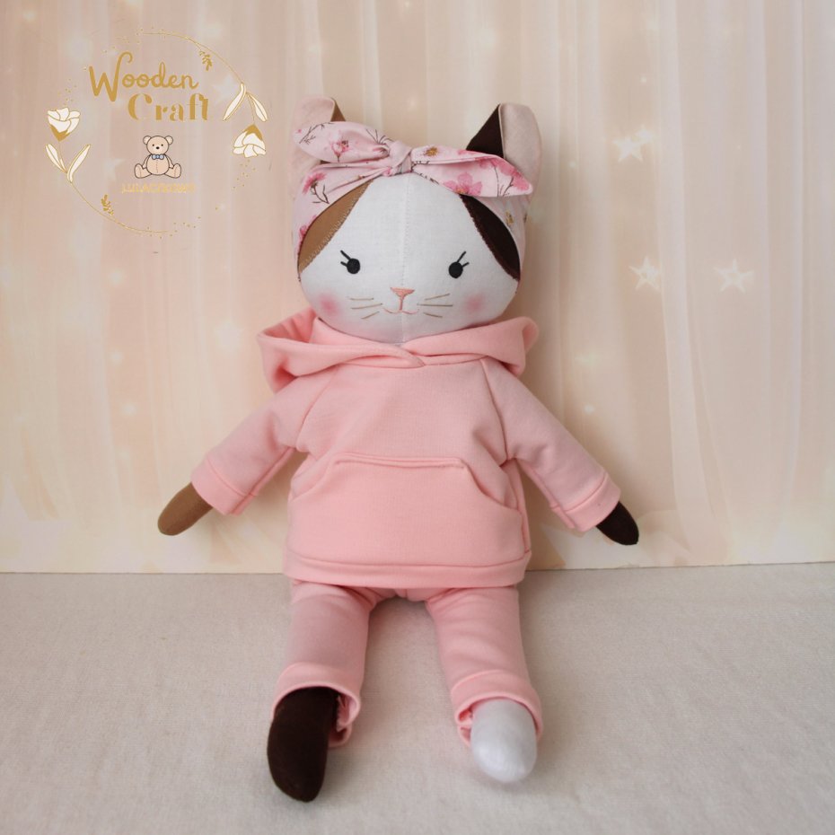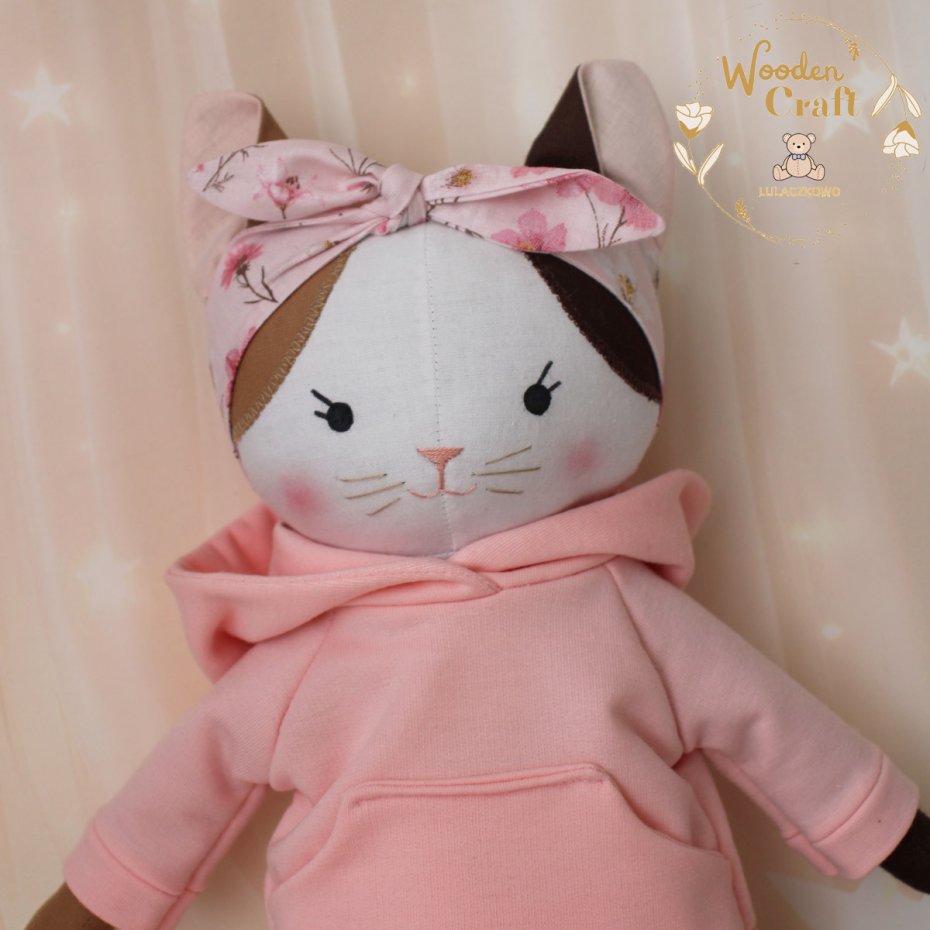 Przeurocza przytulanka, Kicia trikolorka uszyta ręcznie z najwyższą starannością, ubrana w śliczny, mięciutki dresik w kolorze różowym i różową opaskę w kwiatuszki. Wykonana ze 100% bawełny, wypełniona antyalergiczną kulką silikonową. Oczka malowane wodoodpornym markerem, nosek i uśmiech wyszyty muliną, uszko ozdobione kokardką. Górne i dolne łapki układają się luźno, kicia siedzi z podparciem. Sukieneczkę można swobodnie zdejmować, jest zapinana na rzep.