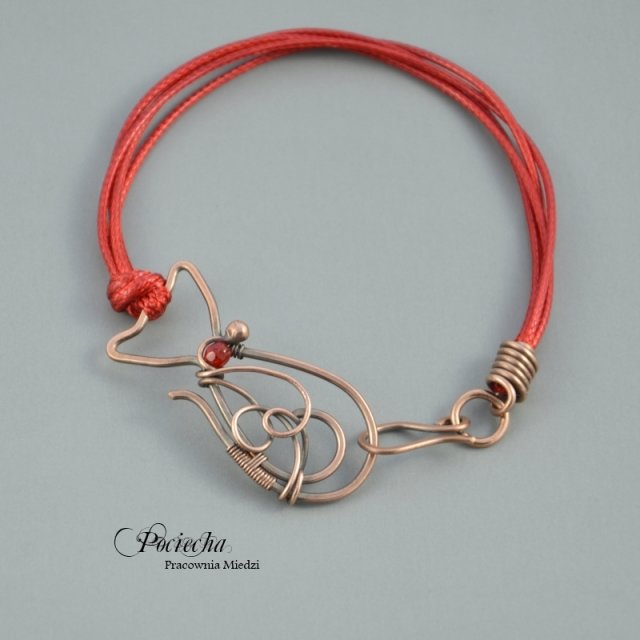 Kotek ma wymiary ok. 3,8 x 1,8 cm. Miedź patynowana i polerowana. Sznurek jubilerski w kolorze niebieskim. Zapięcie kute ręcznie typu haczyk.